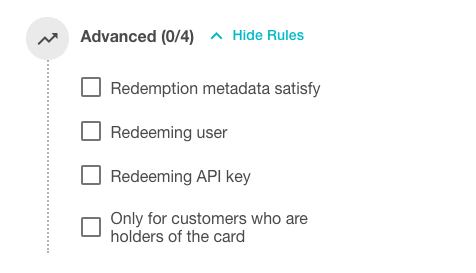 Validation rules can be assigned to incentives (discounts, coupons, gift cards, digital rewards, referral codes) and earning rules.